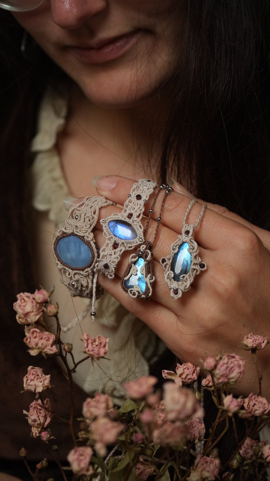 Labradorite bleu profond, coton couleur lin aux nuances naturelles et perles argentées créent un éclat délicat, ponctué de touches boisées.